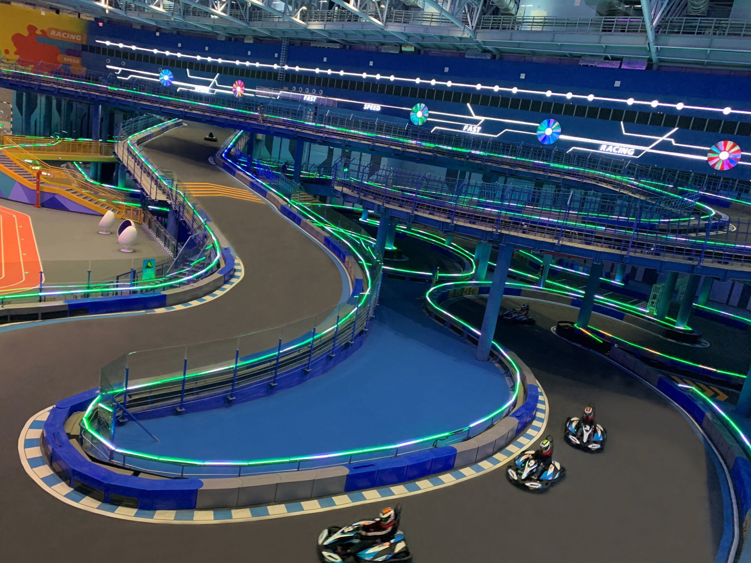 We developed a concept plan within the given space and themed the venue fully on the clients’ vision, colors and logo. We worked around with different track layouts that we produced in order to optimize the space and ensure an enjoyable flow for the track whilst ensuring maximum safety. The colors given were green and blue which we incorporated into the track and facilities general color theming to give a bold yet classy building interior design.